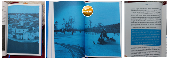 Buku ini juga dilengkapi gambar-gambar yang menarik dicetak warna biru atau hitam putih yang menampilkan berbagai panorama Swedia dan foto-foto lainnya. Ga heran, karena Lola memang seorang travel writer dan fotografer.