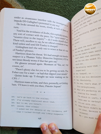 Untuk proses wawancara, dari dulu buku-buku seri Adam Fawley selalu menampilkan percakapan pihak polisi dengan saksi atau tersangka. Bagian ini biasanya dibedakan dengan penggunaan jenis huruf tertentu. Contohnya seperti foto yang saya tampilkan di bawah ini.