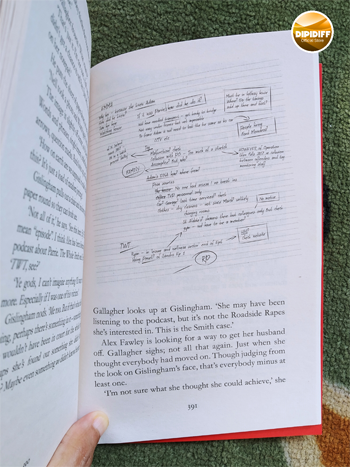Buat yang suka ikutan menebak sambil membaca, novel yang ini juga menjabarkan fakta-fakta kasusnya, termasuk sebuah catatan penting yang dibuat oleh Alex (istri Adam Fawley) yang nanti menjadi salah satu kunci penyelesaian konflik. Petunjuk-petunjuk juga sudah disebar dari awal. Kalo kalian suka ikut menganalisa kasus, catatan yang dibuat Alex yang fotonya saya tampilkan di bawah ini asyik sekali buat ditelaah.