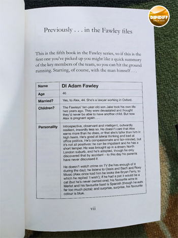 Dari penokohan, tentu ada beberapa tokoh baru terkait kasus yang digarap tim Adam Fawley, misalnya Emma, Caleb, dan Zoe. Saya juga menemukan halaman info tokoh di bagian depan yang seingat saya tidak ada di novel-novel sebelumnya. Ini bagian yang membantu sekali, karena dalam waktu singkat saya jadi bisa mengingat ulang tokoh-tokoh dalam cerita, terutamanya tim DI Fawley, misalnya Gislingham, Quinn, Somer, Everett, dan Baxter. Saya kira juga, halaman ini akan membantu para pembaca yang baru pertama kali menyimak buku seri Adam Fawley supaya bisa segera masuk ke dalam cerita, karena terus terang saja jumlah tokoh cerita memang cukup banyak, dan saya yakin akan ada pembaca yang kebingungan, apalagi kalau belum pernah membaca buku seri Adam Fawley sebelumnya.