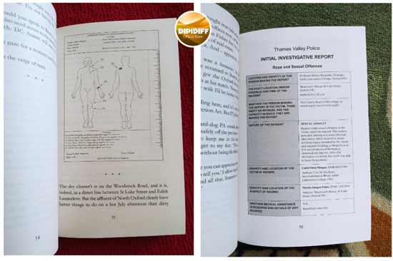 Ada halaman diary korban yang diekspos di buku ini. Mungkin akan agak membingungkan ketika harus membedakan ini halaman diary atau halaman sedang berubah menjadi pov 1 Emma (korban pembunuhan). Tapi kalau dibaca dengan seksama, mestinya bisa membedakan. Coba cek dua kutipan yang saya tampilkan di bawah, dan analisa mana yang diary dan mana yang bukan.