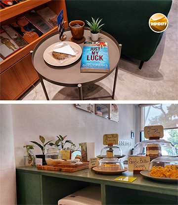 Foto keenam saya ambil di meja menu karena tertarik dengan cake dan cemilannya yang cantik-cantik. Saya posisikan buku berdiri, difoto dengan angle eye level. Saya pastikan posisi benda-benda membentuk pola diagonal dengan lampu yang tertangkap kamera, muncul di bagian atas frame, memberikan kesan tambahan yang indah. Saya edit di Snapseed dengan filter POP 1x dan Accentuate 1x. Lalu saya beri logo dipidiff di apps Photolayer.