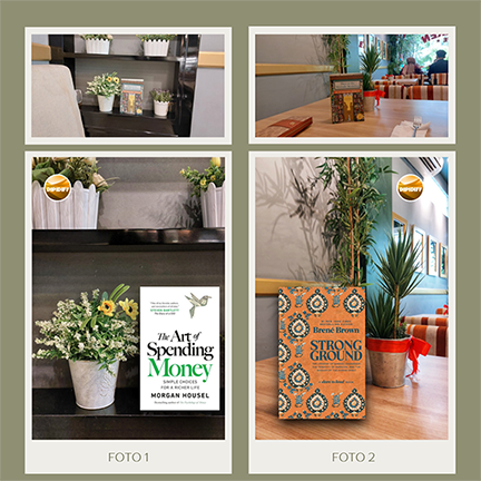 Foto dua saya buat dengan buku yang diberdirikan di meja kayu berwarna coklat, saya pastikan posisinya seolah berurutan dari depan ke belakang; buku, pot tanaman, dan bambu. Tampak kanan ada ruangan yang abu-abu kebiruan, terang efek sinar matahari yang masuk ruangan. Dilihat dari kiri ke kanan, seolah ada pola diagonal; buku, pot tanaman, dan barisan kursi. Rapi membentuk pola. Saya jepret, lalu saya lempar ke aplikasi Snapseed dan beri filter POP 1x. Lalu saya pindahkan ke aplikasi Photolayer dan timpa bagian cover buku dengan file sampul buku terbaru Brene Brown yang judulnya Strong Ground. Buku ini akan cocok sekali di latar ini karena meja coklat yang senada, dan warna biru pada sampul juga senada dengan nuansa biru pada dinding cafe yang terlihat di sebelah kanan foto. Terakhir saya beri logo Dipidiff.
