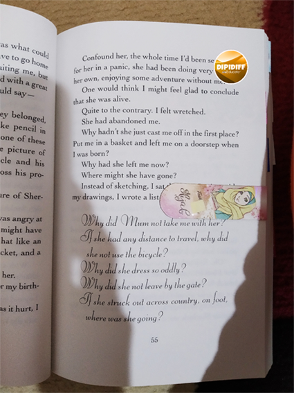 Ada layout khusus di bagian narasi misteri. Sesuai dengan disain sampulnya yang 'meliuk-liuk itu', jenis huruf yang digunakan di bagian ini pun demikian.