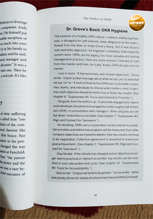 Doerr mengajari mereka tentang pendekatan yang terbukti untuk keunggulan operasi: Sasaran dan Hasil Utama. Dia pertama kali menemukan OKR pada tahun 1970-an sebagai insinyur di Intel, di mana Andy Grove yang legendaris ("manajer terhebat di zamannya atau era apa pun") mengendarai perusahaan terbaik yang pernah dijalankan Doerr. Belakangan, sebagai pemodal ventura, Doerr membagikan gagasan Grove kepada lebih dari lima puluh perusahaan. Di mana pun proses itu dipraktikkan dengan setia, strategi ini berhasil.