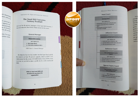 Isinya detail, praktikal dan aplikatif. Sangat cocok bukan hanya untuk kita yang berkarir di perusahaan, tapi juga wirausaha, dan perorangan. Penerapannya menurut saya bisa diaplikasikan ke berbagai bidang kehidupan, tentunya dengan model adaptasi yang tepat. Step by stepnya jelas, bahkan ada yang ditambah dengan bagan juga, seperti turunan Key Results di bawah ini.